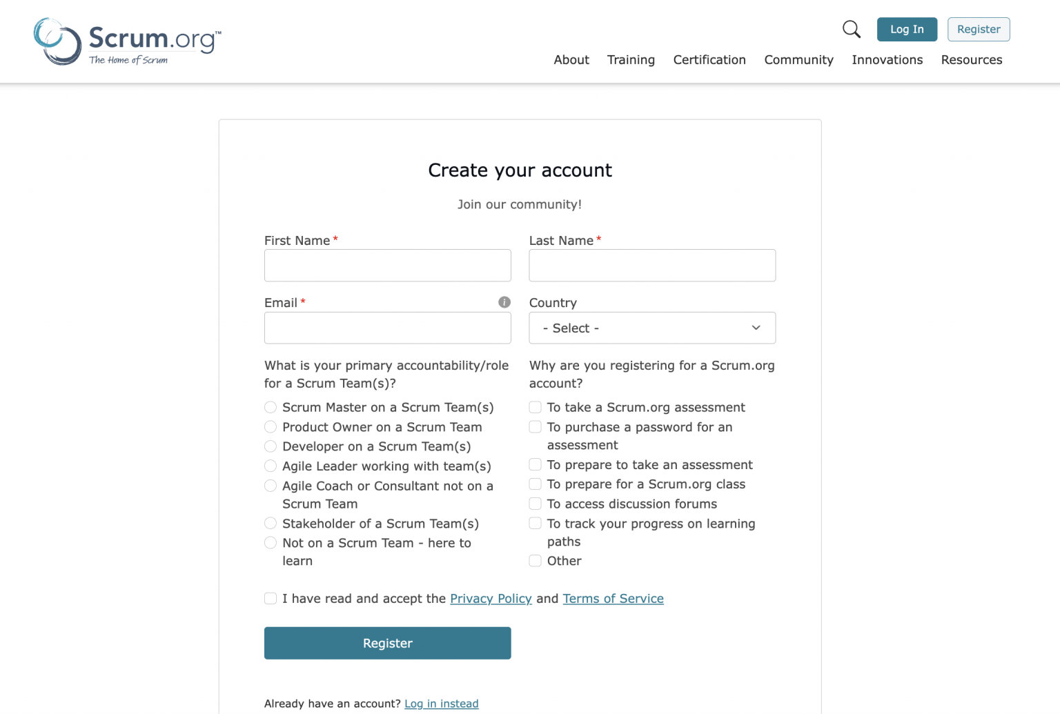 After successfully creating your account, log in to Scrum.org using your newly registered credentials.