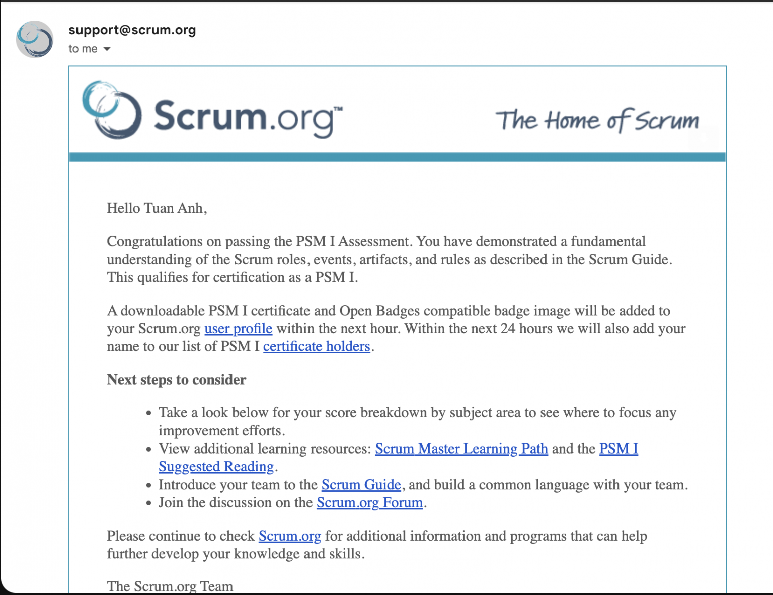 If you achieve the required passing score, you will receive an electronic PSM/PSPO certificate from Scrum.org.
